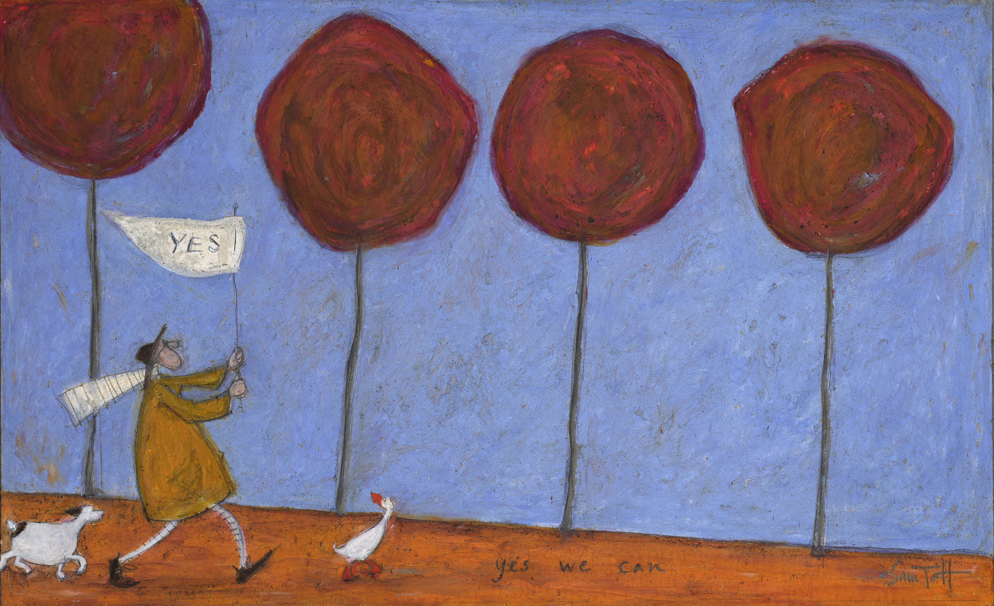 Previously a Catering Manager, Death Grants Advisor, Cinema Usherette and Fire Extinguisher Sales Person, Sam was determined to carve out a niche as an artist. Fifteen years and a whole lot of hard work later, Sam's work is published internationally as posters, greetings cards, calendars and Limited Edition prints and has been sold through outlets such as John Lewis, Paperchase, Next and IKEA. She has had a number of successful solo shows and continues to sell original work through a small number of selected venues. Perhaps Sam's appeal as an artist has something to do with her ability to capture a sense of hope, optimism and good old fashioned British eccentricity. Her characters inhabit a world which is both otherworldly and instantly recognisable. The faded ice cream colours of the British seaside give a feeling of pathos and nostalgia: the wind is often blowing, the weather is often wet, love is often unrequited and there is always sand in the sandwiches.