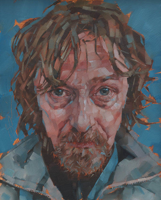 He paints using oils and mainly square brushes, working from the photographs that he takes of his sitters.  In 2008, he was runner up in the BP Portrait award and that same year was elected as a member of the Royal Society of Portrait painters (RP). He was their Vice-President from 2014 to 2021.