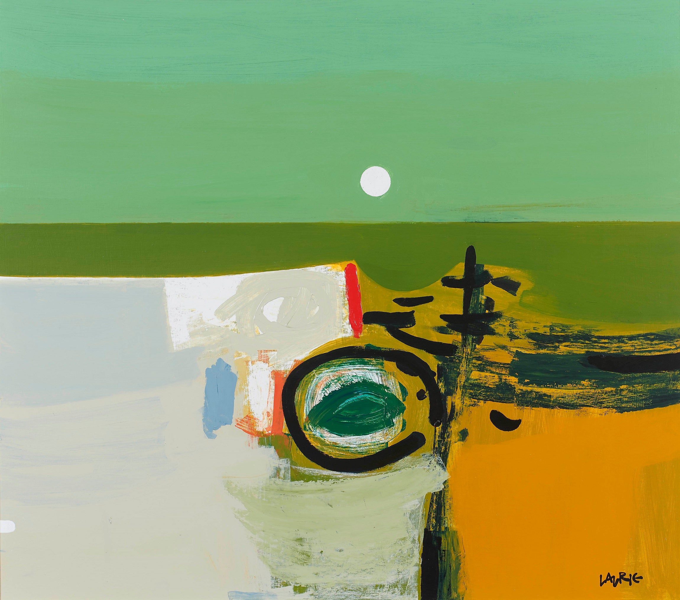 Simon’s paintings are typically inspired by everyday objects and the ever-changing Scottish landscape; they have been said to combine the purity and formalism of the St Ives School with the rich tradition of the Scottish Colourists. On first encounter they appear light hearted and joyous, both in their vibrant palette and choice of everyday items placed in jaunty juxtaposition.  As with many painters of similar stature the rich decorative quality of each work belies a greater complexity.  Simon is a very serious painter and his current approach is the culmination of several decades at his craft. Originally an abstract constructionist he produced monochromatic three-dimensional works before developing a more colourful series of found object boxed sculptures in the 1980s and 1990s. Since then he has returned to the flat surface, to paint and collage, to refine the ideas he had explored to the full in the constructions. These paintings are the culmination of that distillation process, the reduction of reality to simple form and colour.
