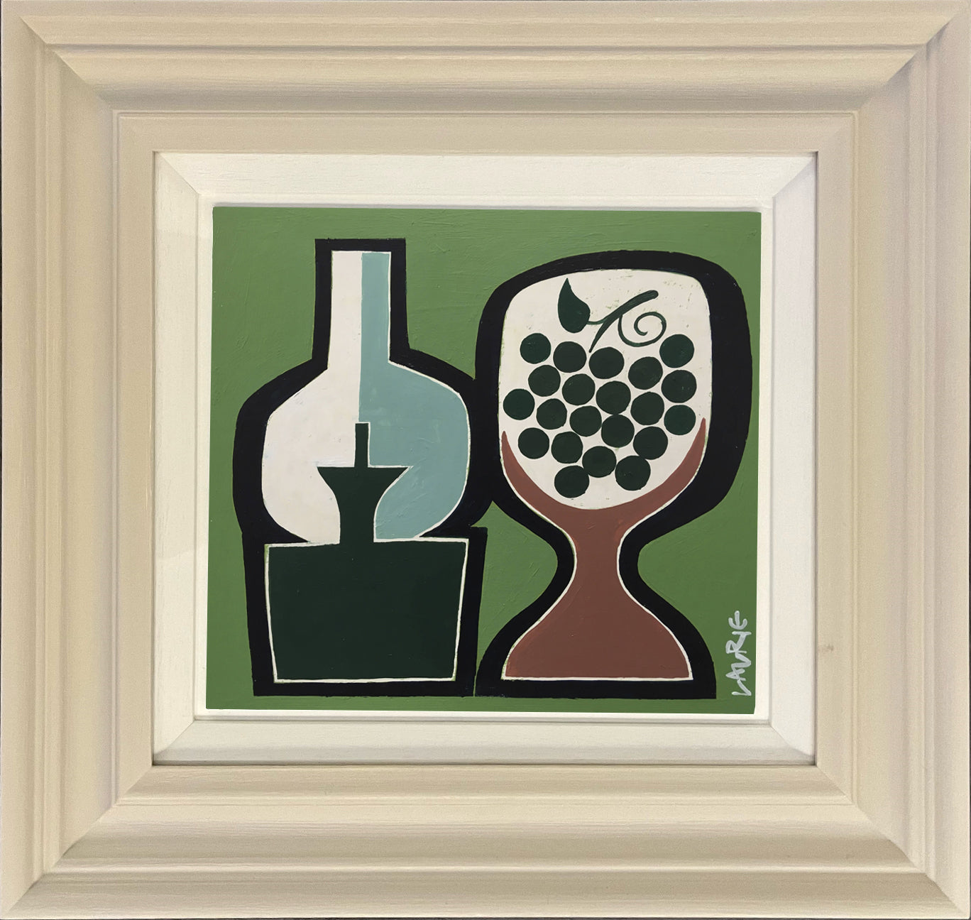 Simon’s paintings are typically inspired by everyday objects and the ever-changing Scottish landscape; they have been said to combine the purity and formalism of the St Ives School with the rich tradition of the Scottish Colourists. On first encounter they appear light hearted and joyous, both in their vibrant palette and choice of everyday items placed in jaunty juxtaposition.  As with many painters of similar stature the rich decorative quality of each work belies a greater complexity.  Simon is a very serious painter and his current approach is the culmination of several decades at his craft. Originally an abstract constructionist he produced monochromatic three-dimensional works before developing a more colourful series of found object boxed sculptures in the 1980s and 1990s. Since then he has returned to the flat surface, to paint and collage, to refine the ideas he had explored to the full in the constructions. These paintings are the culmination of that distillation process, the reduction of reality to simple form and colour.