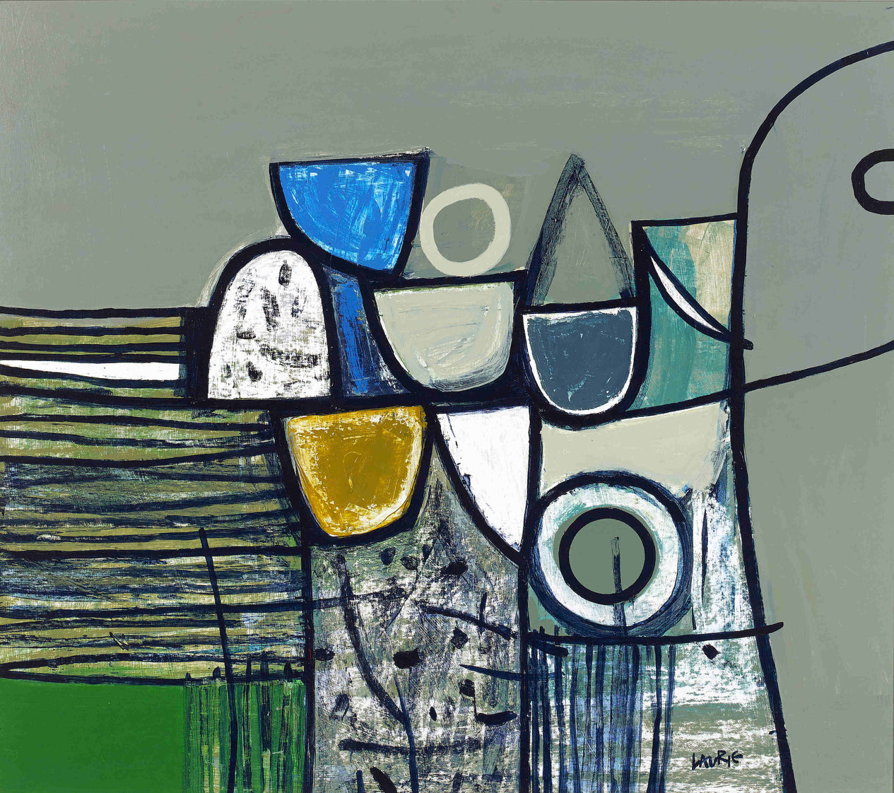 Simon’s paintings are typically inspired by everyday objects and the ever-changing Scottish landscape; they have been said to combine the purity and formalism of the St Ives School with the rich tradition of the Scottish Colourists. On first encounter they appear light hearted and joyous, both in their vibrant palette and choice of everyday items placed in jaunty juxtaposition.  As with many painters of similar stature the rich decorative quality of each work belies a greater complexity.  Simon is a very serious painter and his current approach is the culmination of several decades at his craft. Originally an abstract constructionist he produced monochromatic three-dimensional works before developing a more colourful series of found object boxed sculptures in the 1980s and 1990s. Since then he has returned to the flat surface, to paint and collage, to refine the ideas he had explored to the full in the constructions. These paintings are the culmination of that distillation process, the reduction of reality to simple form and colour.