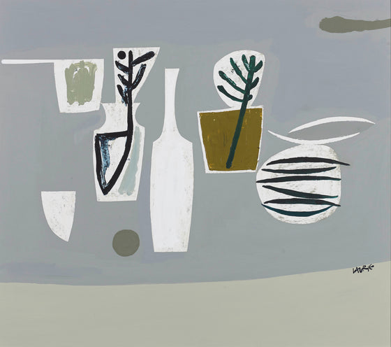 Simon’s paintings are typically inspired by everyday objects and the ever-changing Scottish landscape; they have been said to combine the purity and formalism of the St Ives School with the rich tradition of the Scottish Colourists. On first encounter they appear light hearted and joyous, both in their vibrant palette and choice of everyday items placed in jaunty juxtaposition.  As with many painters of similar stature the rich decorative quality of each work belies a greater complexity.  Simon is a very serious painter and his current approach is the culmination of several decades at his craft. Originally an abstract constructionist he produced monochromatic three-dimensional works before developing a more colourful series of found object boxed sculptures in the 1980s and 1990s. Since then he has returned to the flat surface, to paint and collage, to refine the ideas he had explored to the full in the constructions. These paintings are the culmination of that distillation process, the reduction of reality to simple form and colour.