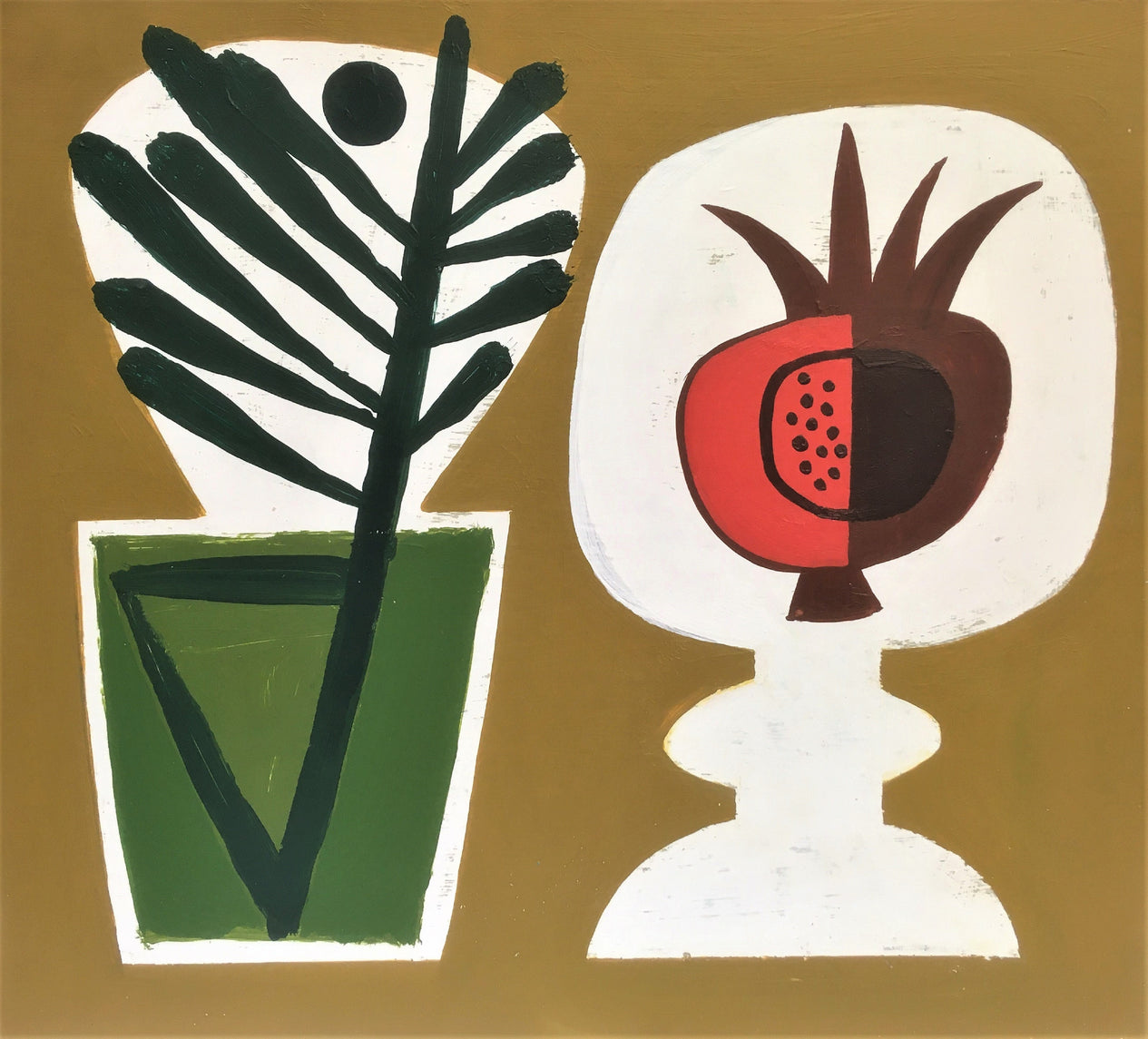 Simon’s paintings are typically inspired by everyday objects and the ever-changing Scottish landscape; they have been said to combine the purity and formalism of the St Ives School with the rich tradition of the Scottish Colourists. On first encounter they appear light hearted and joyous, both in their vibrant palette and choice of everyday items placed in jaunty juxtaposition.  As with many painters of similar stature the rich decorative quality of each work belies a greater complexity.  Simon is a very serious painter and his current approach is the culmination of several decades at his craft. Originally an abstract constructionist he produced monochromatic three-dimensional works before developing a more colourful series of found object boxed sculptures in the 1980s and 1990s. Since then he has returned to the flat surface, to paint and collage, to refine the ideas he had explored to the full in the constructions. These paintings are the culmination of that distillation process, the reduction of reality to simple form and colour.