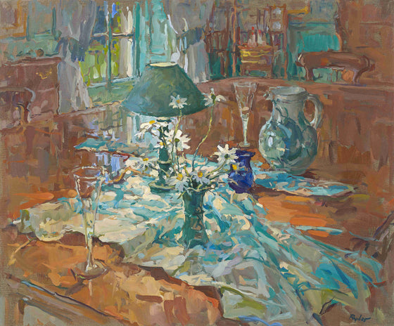 Sue began painting professionally at an early age. Encouraged by her father, Robert Ryder VC, an enthusiastic amateur painter who imbued his daughter with a similar passion, she entered the prestigious Byam Shaw School of Art. There, her tutor, Bernard Dunstan, introduced her to the work of the post- impressionist Edouard Vuillard, whose gentle scenes of intimate interiors, domestic spaces and gardens in soft blurred colours proved a significant influence on her painting style and choice of subject for the rest of her career. Sue was only 18, and still a student, when she first exhibited at the Royal Academy. She married shortly after, spending the next decade juggling the demands of her career with that of her young family, painting both interiors and portraits.