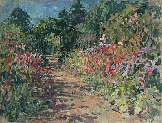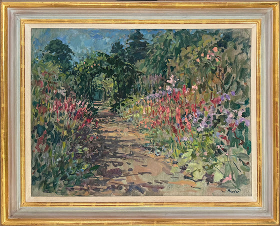 Sue began painting professionally at an early age. Encouraged by her father, Robert Ryder VC, an enthusiastic amateur painter who imbued his daughter with a similar passion, she entered the prestigious Byam Shaw School of Art. There, her tutor, Bernard Dunstan, introduced her to the work of the post- impressionist Edouard Vuillard, whose gentle scenes of intimate interiors, domestic spaces and gardens in soft blurred colours proved a significant influence on her painting style and choice of subject for the rest of her career. Sue was only 18, and still a student, when she first exhibited at the Royal Academy. She married shortly after, spending the next decade juggling the demands of her career with that of her young family, painting both interiors and portraits.