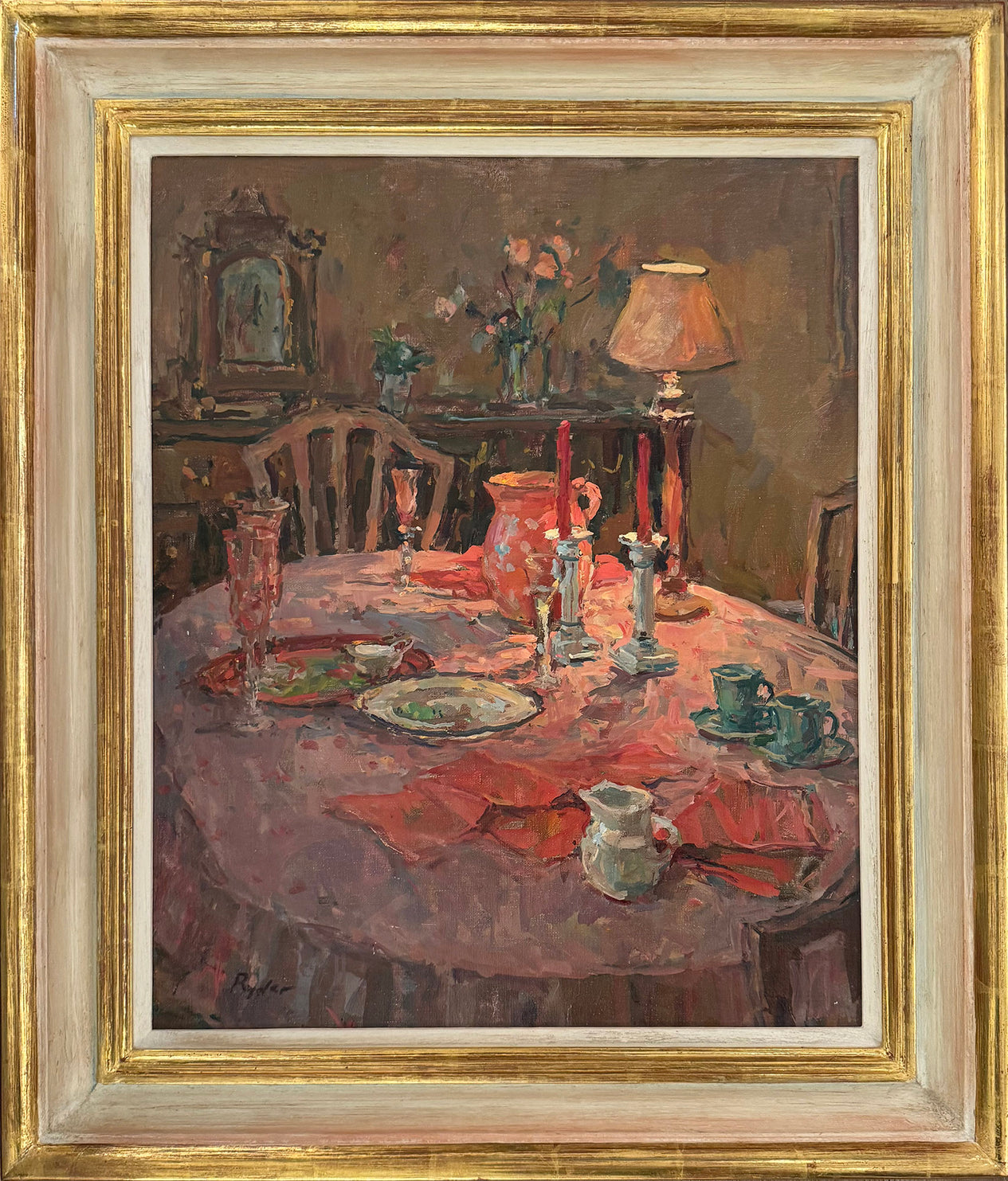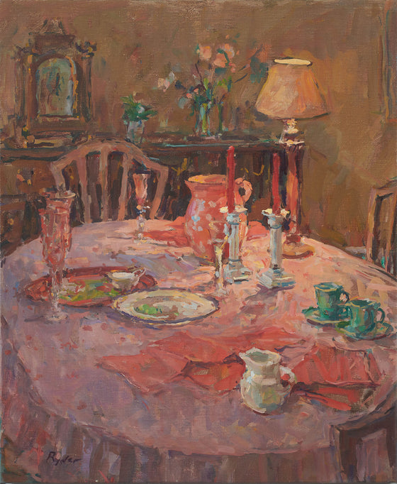 Sue began painting professionally at an early age. Encouraged by her father, Robert Ryder VC, an enthusiastic amateur painter who imbued his daughter with a similar passion, she entered the prestigious Byam Shaw School of Art. There, her tutor, Bernard Dunstan, introduced her to the work of the post- impressionist Edouard Vuillard, whose gentle scenes of intimate interiors, domestic spaces and gardens in soft blurred colours proved a significant influence on her painting style and choice of subject for the rest of her career. Sue was only 18, and still a student, when she first exhibited at the Royal Academy. She married shortly after, spending the next decade juggling the demands of her career with that of her young family, painting both interiors and portraits.