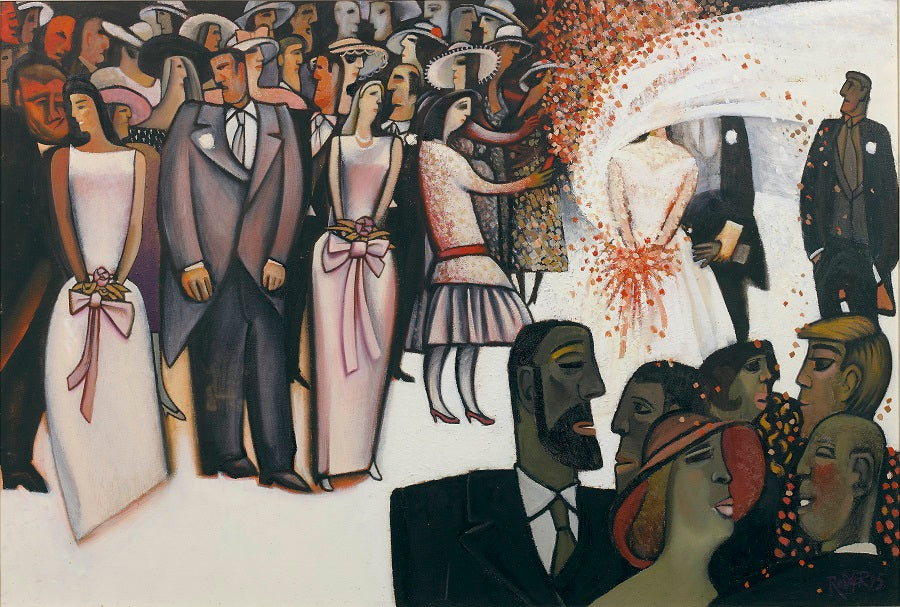 He was a successful commercial graphic artist and stain glass designer, collaborating with the glass painter John K Clark on sets of windows in the parish churches of Kippen, St Mary’s Kirkintilloch and Milton of Campsie. Of the many book jackets featuring his work perhaps the best known are the 1983 edition of Monica Clough’s ‘Field of Thistles’ and more recently Liz Lochhead’s ‘The Colour of Black and White’ in 2003. Lochhead, a former Scots Makar, formed a strong personal bond with Willie and included two poems inspired by him and his work in her 2016 collection ‘Fugitive Colours’. She went on to describe his paintings as ‘deep saturations of pure colour’. Never an artist to be restricted by medium, his linocuts have been interpreted by the Dovecot Studios in both gun-tufted rug and tapestry.